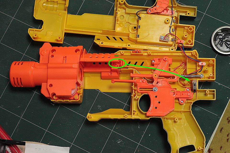 したがって,改造後はハッチを空けてもスイッチ ON のままトリガーを引くとローラーが回転します。
