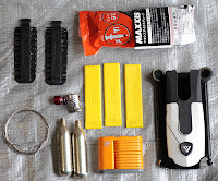 常備していた物を全部出して見ると意外に少なく感じますが,実は仕切りの関係であまり幅のあるものは入れられず,普段はこれに携帯電話・予備電池(電話用)・財布・ワイヤー錠を追加してほぼ満タン。