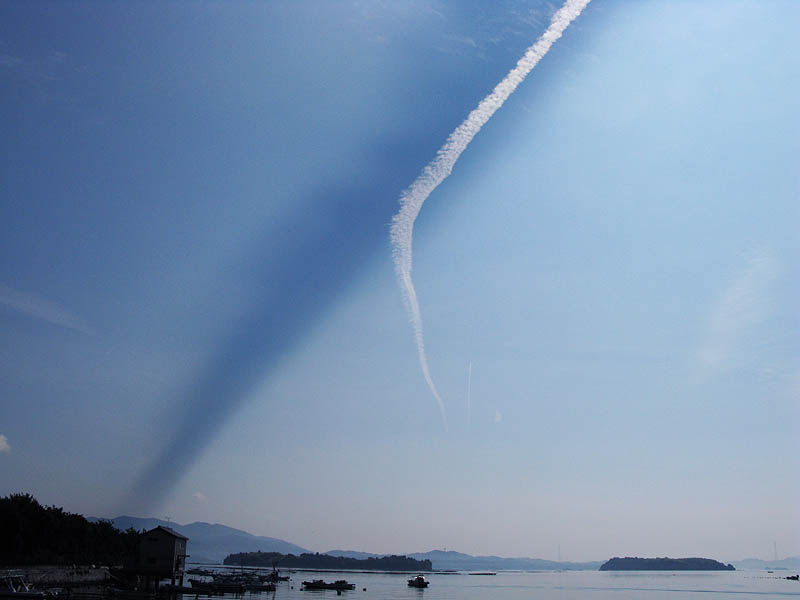 途中「小松原海水浴場」付近で橋を撮影していたら,飛行機雲が太陽を隠して変わった影を作っていました。